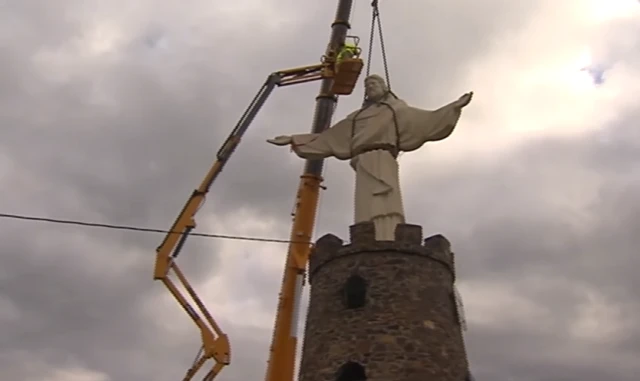 Im Dezember 2024 war es endlich so weit: Die in zwei Teile zerlegte Christusstatue wurde in einer aufwendigen Aktion zu ihrem endgültigen Standort transportiert. Für dieses Unterfangen waren drei große Kräne, mehrere Traktoren und Lastwagen sowie fünf Stunden intensive Arbeit erforderlich.