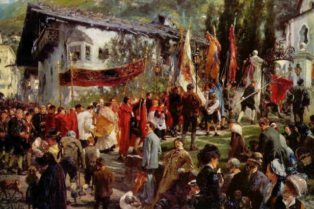 Das charakteristischste Element des Fronleichnamsfestes ist die Prozession, bei der die geweihte Hostie in einer Monstranz, einem kunstvoll gestalteten Schaugefäß, durch die Straßen getragen wird. Sie symbolisiert, dass Christus in die Welt hinausgetragen wird und der Glaube auch im öffentlichen Raum gelebt werden soll.